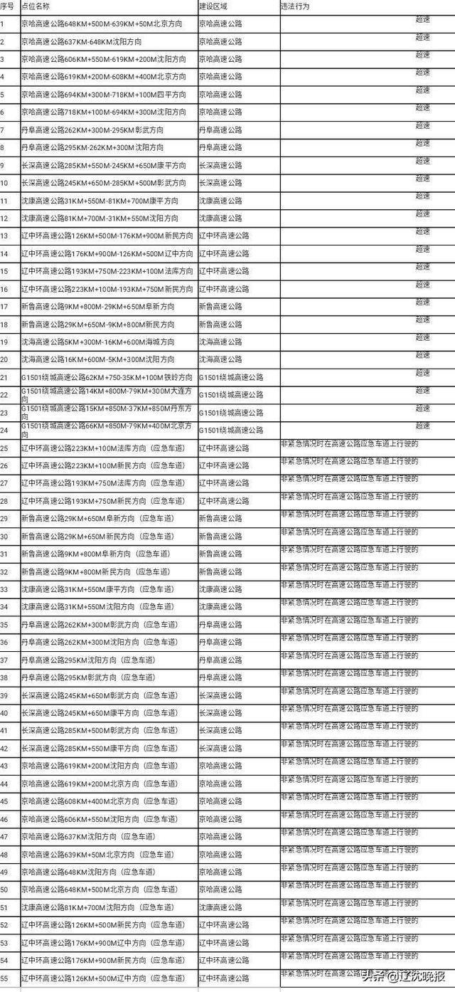 8月26日,沈陽市公安局交通警察局發(fā)布消息,為了更好的發(fā)揮科技設施在交通管理中的作用,進一步規(guī)范行車秩序和行車安全,沈陽市新建“電子警察”55處。其中G1501繞城高速公路4處,丹阜高速公路6處, 京哈高速公路14處, 遼中環(huán)高速公路12處, 沈海高速公路2處, 沈康高速公路5處, 新魯高速公路6處, 長深高速公路6處。主要抓拍超速;非緊急情況時在高速公路應急車道上行駛的交通違法行為。